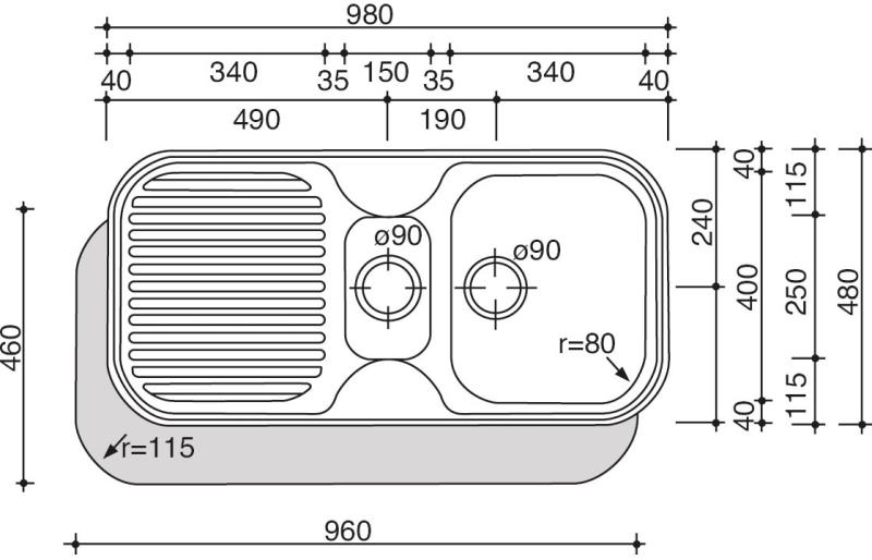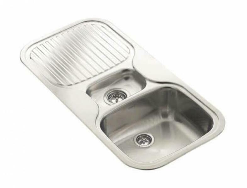 egymedencés mosogatótálca csümölcsmosóval, csepegtetővel, 3 1/2" szűrő, megfordítható csaplyuk nélküli, medence mélység: 165/65 mm, rozsdamentes acél, 2 év garancia, méret: 980x480 mm, minimum szekrényméret: 600 mm, tartozékok: szifon készlet, szűrő készlet, lefogató körmök